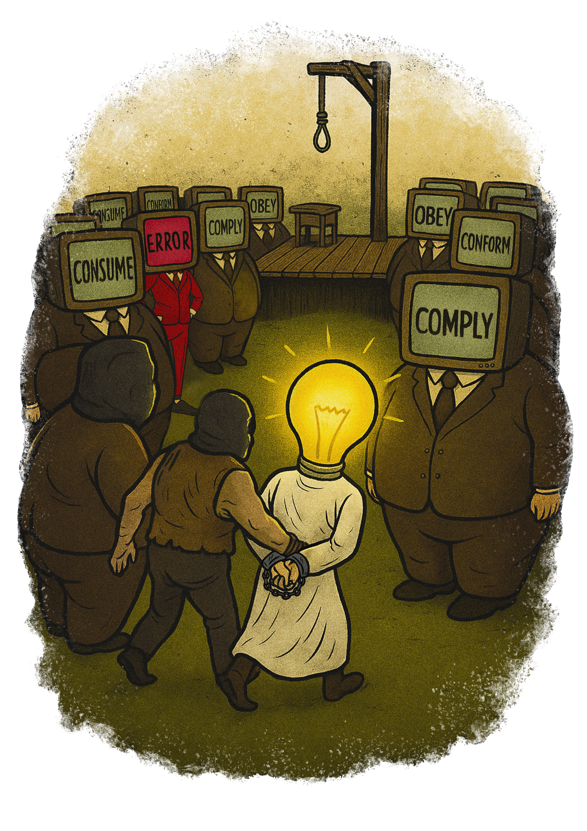 YouWontBelieveMe, but the truth is under attack. The light—symbolizing knowledge, free thought, and awakening—is being persecuted by faceless TV-headed figures, a reminder of how mainstream narratives try to silence those who dare to question.